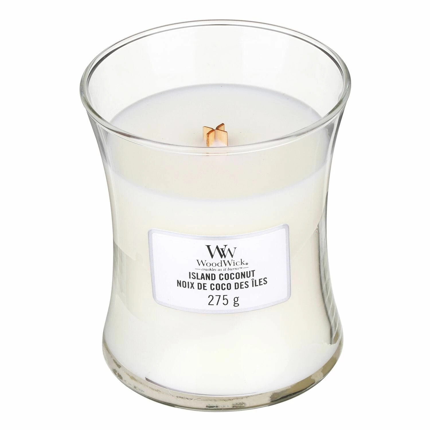 The cream tinged tone in this WoodWick candle imitates the sight of luscious sandy shores, waved in tropical and sweet tones. Allow a contrast of sharp yet sweet pineapple and the cream filled juiciness of coconuts inspire thoughts of laying on a sun-stricken beach, palm trees swaying with a tropical aroma in the air. This refreshing scent is complimented by the unique shape of the candle holder which is an hourglass.