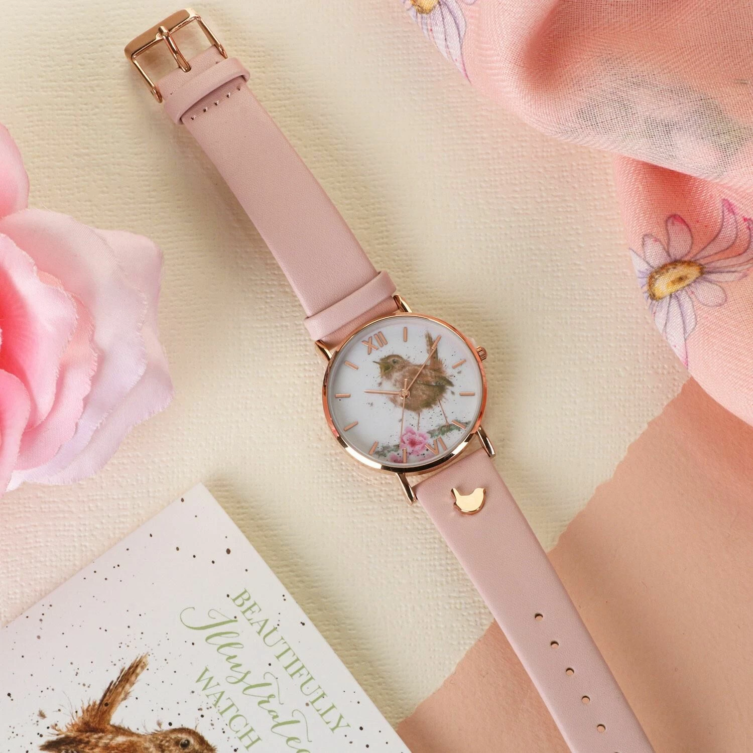 This charming and elegant wrist watch has a large clock face with rose gold details including dashes for each hour along and roman numerals for 12 and 6. Adjust the time using the pin on the side of this watch which has three hands, including a seconds hand! Featuring a pastel pink leather wrist strap with adjustable buckle, this luxurious watch is finished off with a rose gold Wrendale logo on the strap.