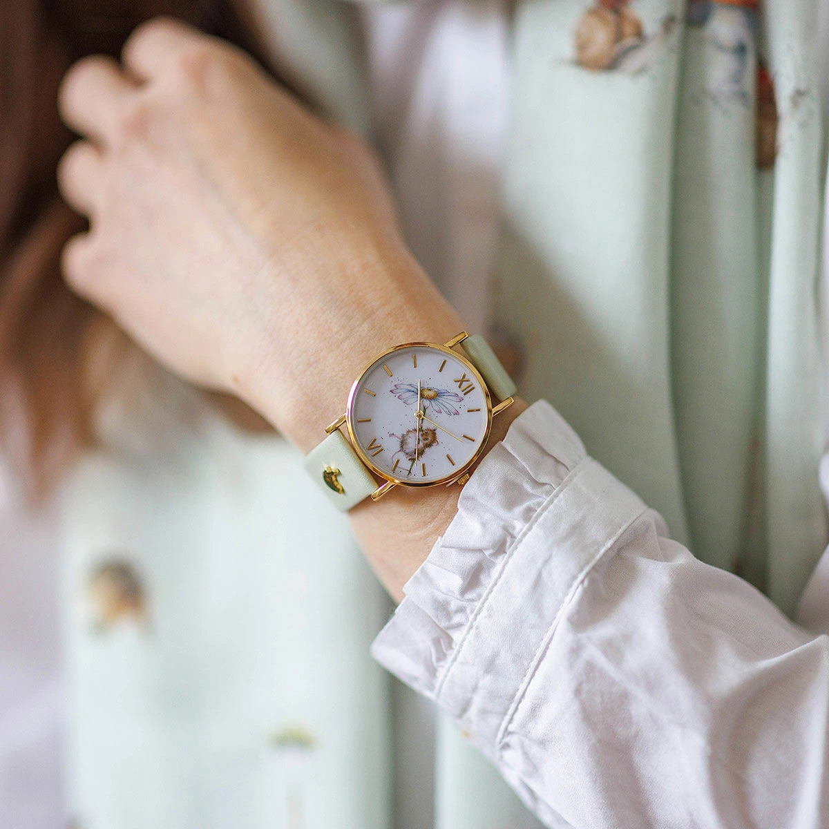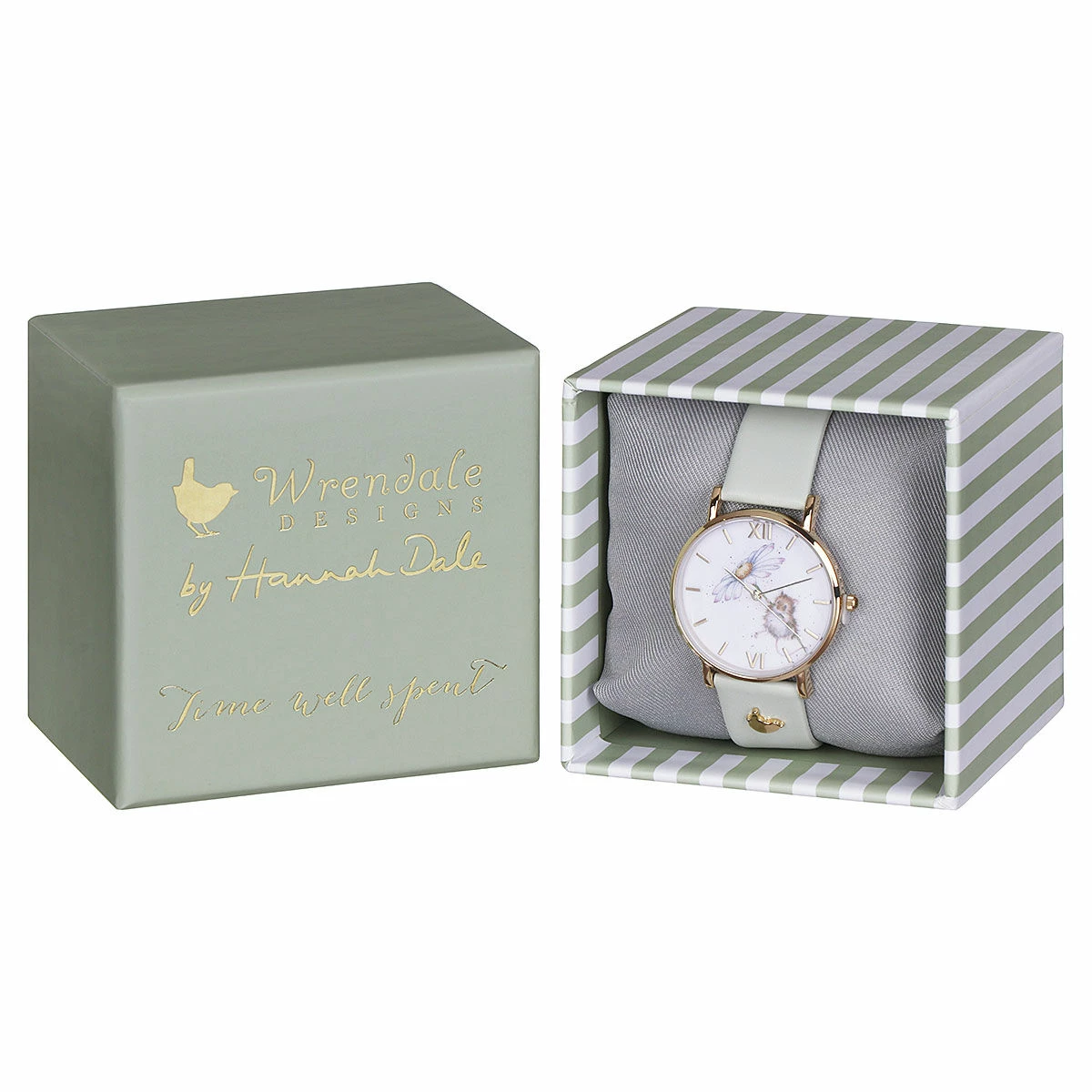 This charming and stylish wrist watch has a large clock face with gold details including dashes for each hour and roman numerals for twelve and six. The watch has three hand that will tick round, including a hand that tells you the seconds. To adjust the time, simply use the pin on the right-hand side of the clock face. This classy watch features a pale green leather wrist strap with adjustable buckle so it can be easily adjusted to fit you perfectly. This elegant watch is finished off with a gold wren of the Wrendale logo on the strap.