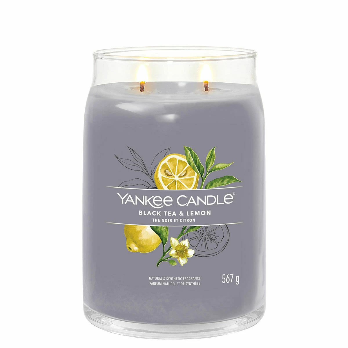 Enjoy the wonderful Black Tea & Lemon fragrance in the wonderful Signature Large Jar Candle, a sleek glass vessel that compliments the fragrance and will look wonderful in your home. This wonderful aroma from Yankee Candle will fill any room with scents of black tea sweetened with lemon, lime and musky notes.