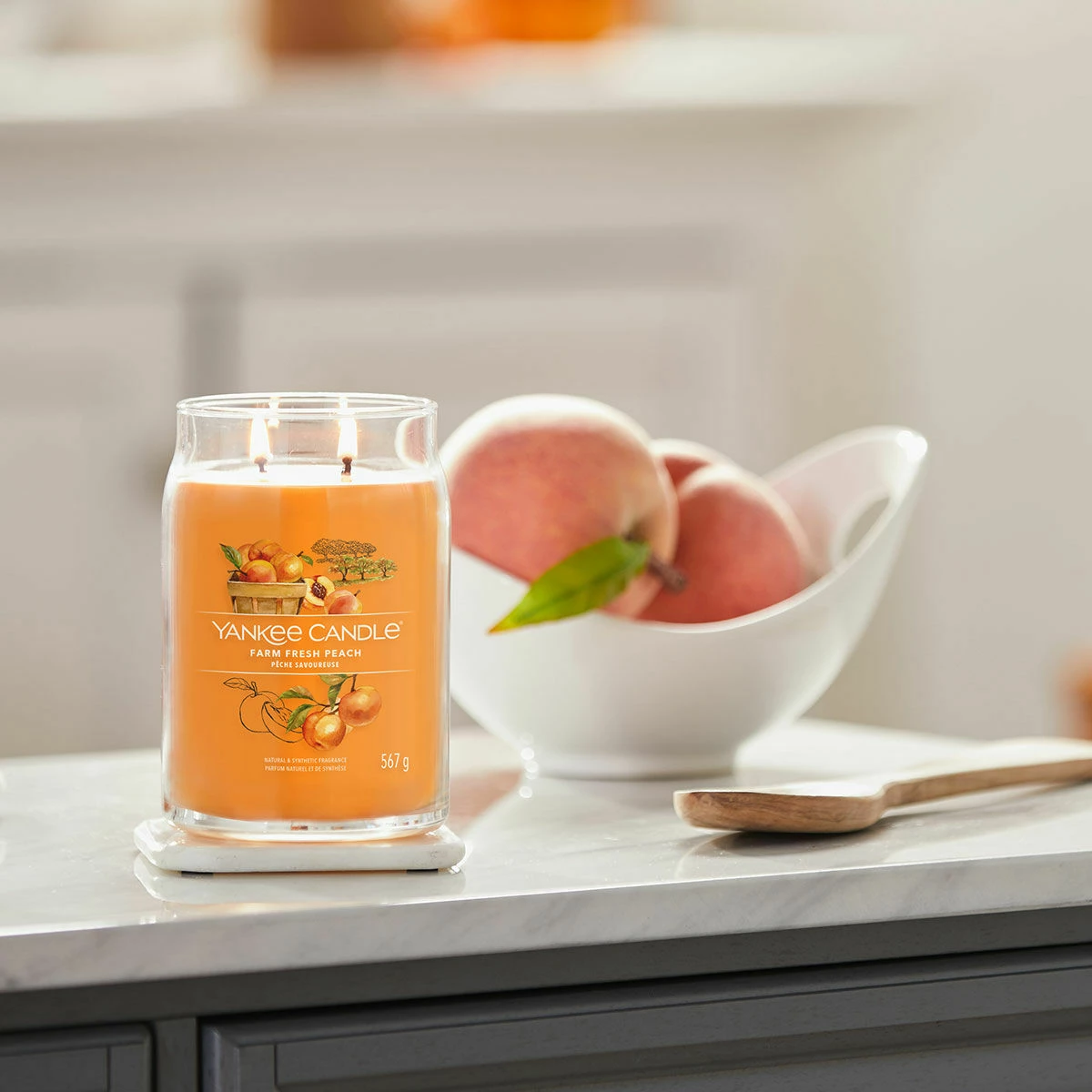Enjoy the wonderful Farm Fresh Peach fragrance in the wonderful Signature Large Jar Candle, a sleek glass vessel that compliments the fragrance and will look wonderful in your home. The wonderful fragrance from Yankee Candle has fresh aromas of peach and apricot will make your mouth water for farm fresh, autumnal delicacies.