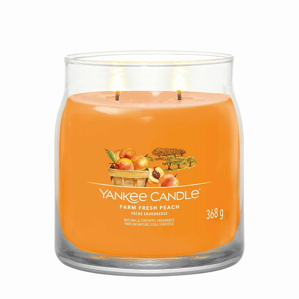 Enjoy the wonderful Farm Fresh Peach fragrance in the wonderful Signature Medium Jar Candle, a sleek glass vessel that compliments the fragrance and will look wonderful in your home. The wonderful fragrance from Yankee Candle has fresh aromas of peach and apricot will make your mouth water for farm fresh, autumnal delicacies.