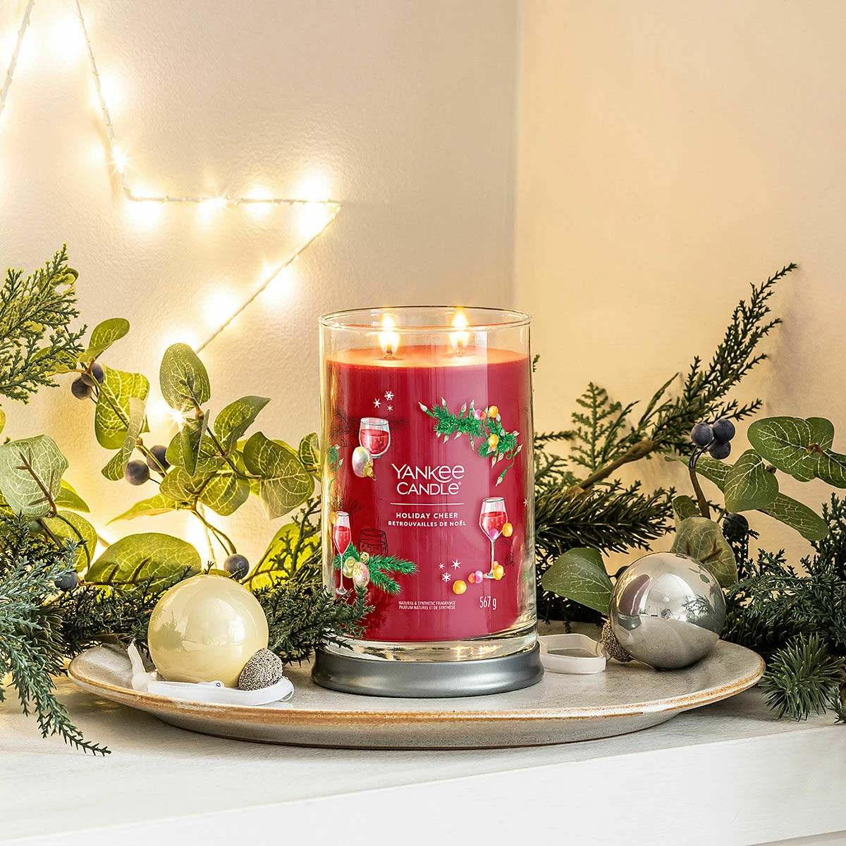 Enjoy the luxurious aroma of Holiday Cheer with this wonderful Signature Large Tumbler from Yankee Candle. This candle comes in a sleek glass vessel with straight sides that complement the fragrance and will look wonderful in any home décor theme. The candle comes with a silver metal lid that doubles as a stand to sit your candle on to protect your surfaces.