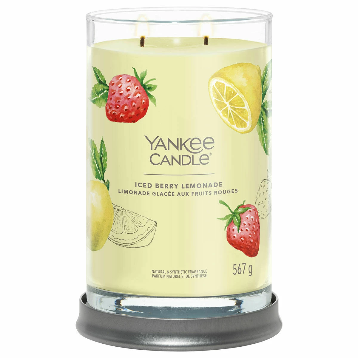 This luxurious Iced Berry Lemonade aroma from Yankee Candle will have you picturing yourself enjoying a glass of ice berry lemonade on a hot summer’s day in the sun. This Signature Large Tumbler is a sleek glass vessel with straight sides that complement the fragrance and will look wonderful in any home décor theme, perfect for any home. The candle comes with a silver metal lid that doubles as a stand to sit your candle on to protect your surfaces. This refreshing scent of freshly squeezed lemonade is certain to fill any room with a springtime sensation.