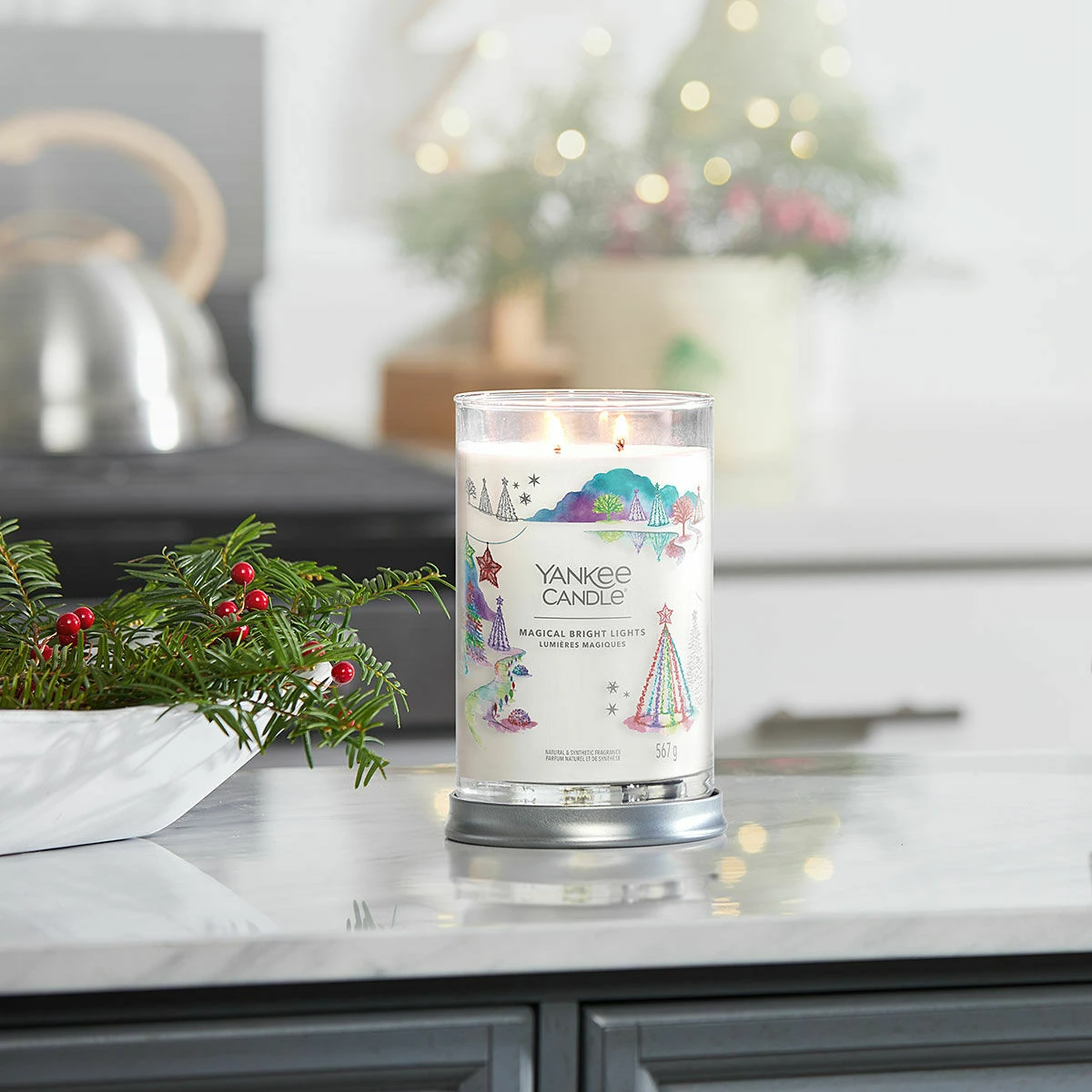 Enjoy the magnificent aroma of Magical Bright Lights with this wonderful Signature Large Tumbler from Yankee Candle. This candle comes in a sleek glass vessel with straight sides that complement the fragrance and will look wonderful in any home décor theme. The candle comes with a silver metal lid that doubles as a stand to sit your candle on to protect your surfaces.