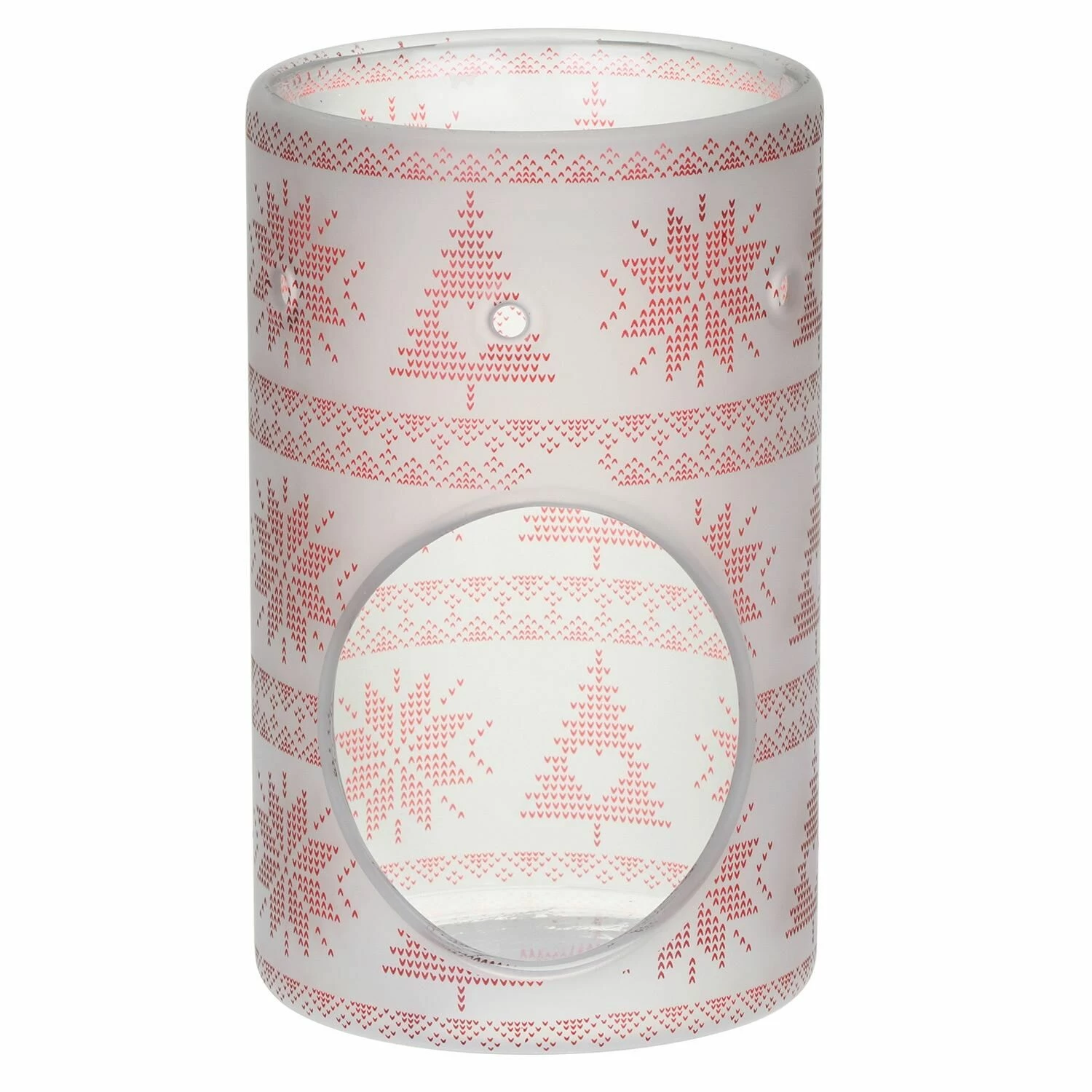 Made from frosted glass and cylindrical in shape, it features a red, Nordic inspired pattern made up of small dots which form Christmas Trees, Snowflakes and a geometric border which can be seen above and below the design.