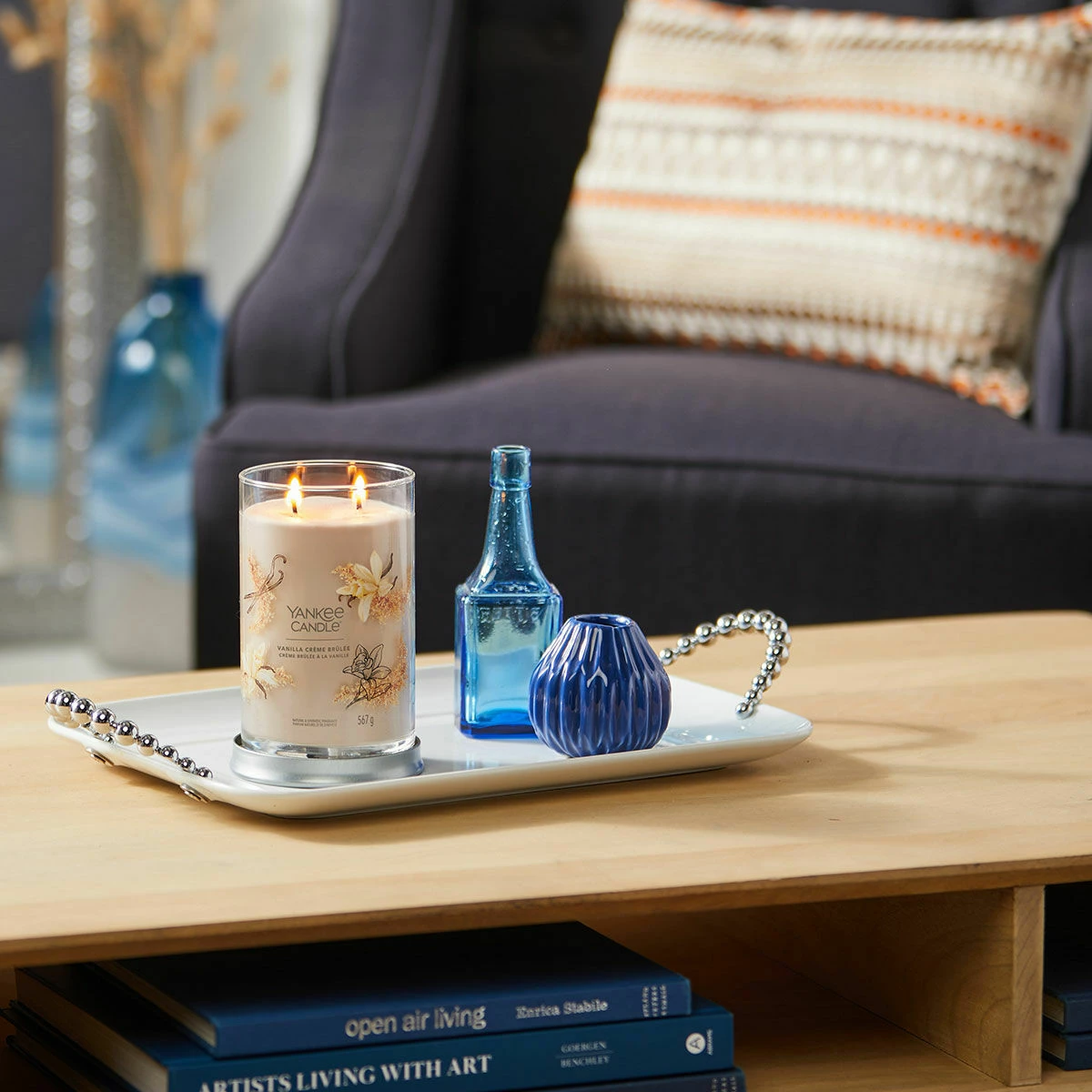 Enjoy the gorgeous aroma of Vanilla Crème Brûlée with this wonderful Signature Large Tumbler from Yankee Candle. This candle comes in a sleek glass vessel with straight sides that complement the fragrance and will look wonderful in any home décor theme. The candle comes with a silver metal lid that doubles as a stand to sit your candle on to protect your surfaces. This aroma will remind you of the rich and creamy vanilla custard dessert intertwined with toasted praline and a hint of cinnamon. It will leave your mouth watering for the delicious treat topped with a crisp layer of caramelised sugar.