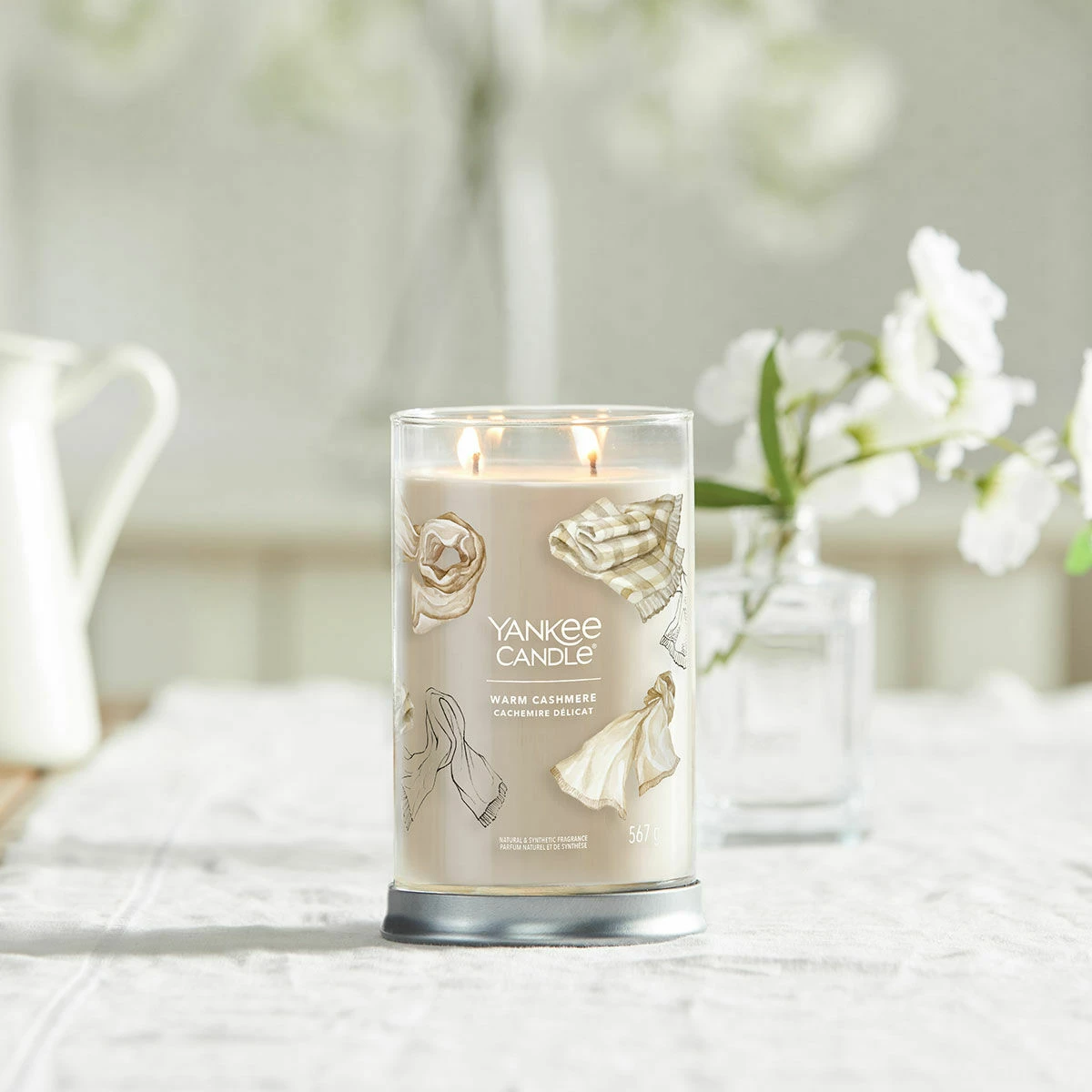 Enjoy the gorgeous aroma of Warm Cashmere with this wonderful Signature Large Tumbler from Yankee Candle. This candle comes in a sleek glass vessel with straight sides that complement the fragrance and will look wonderful in any home décor theme. The candle comes with a silver metal lid that doubles as a stand to sit your candle on to protect your surfaces. This fragrance will uplift your senses with its warm and invigorating notes. It is a scent to burn in front of the first autumn fire, or while enjoying a book on the sofa, with the view of the leaves changing colour through the window.